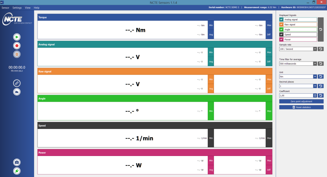 另一方面,我們的軟件由之前的簡(jiǎn)易讀取界面升級(jí)成多功能采集數(shù)顯界面,包含扭矩,原始電壓,電壓增量,角速度,轉(zhuǎn)速,功率等完整曲線顯示和分析